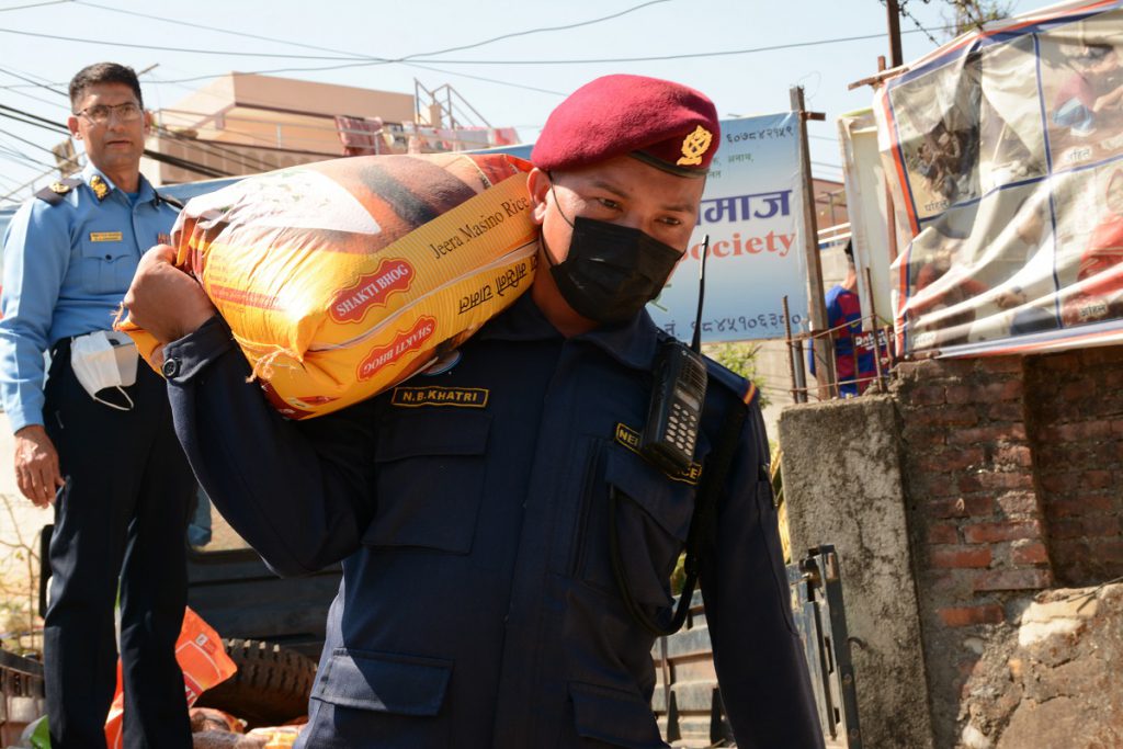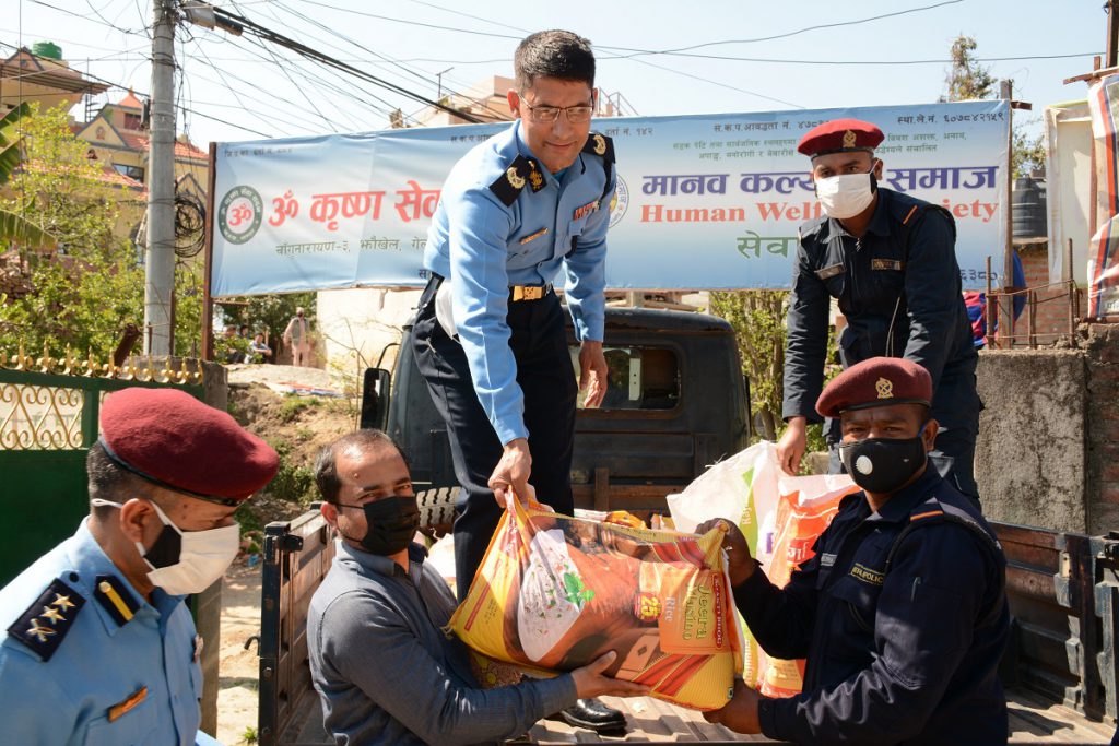 कोरोना भाइरस (कोभिड १९) महामारी रोकथामको लागि नेपाल सरकारले अंगिकार गरेको लक डाउन नीतिको कारण असहाय, अपांग तथा ज्यालादारी गरी गुजारा चलाउने व्यक्तिहरु समस्यामा पर्न गई दैनिक खाना खान समेत मुस्किल परेको यस बिषम् परिस्थितिमा महानगरीय प्रहरी कार्यालयको बिशेष पहल एवं बिभिन्न बैंकहरुसंगको सहकार्यमा निशुल्क खाद्य सामाग्री वितरण अभियान अन्तर्गत आज मानव कल्याणसमाज झौखेल, भक्तपुरमा आश्रीत ६३ जना फरक क्षमता भएका, अशक्त,असहाय व्यक्तिहरु, हनुमन्ते कोरिडोर ठीमी चारदोबाटोमा बस्दै आएका २० जना र सल्लाघारीमा बस्दै आएका १२ जना दैनिक ज्यालादारी मजदुरहरुलाई महानगरीय प्रहरी कार्यालयका प्रमुख विश्वराज पोखरेल आफै उपस्थित भई अत्यावश्यक खाद्य सामाग्री वितरण गर्नु भयो ।