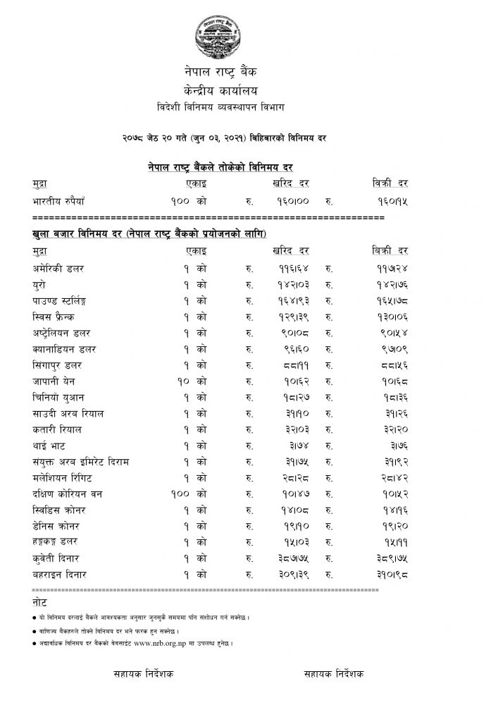 नेपाल राष्ट्र बैंकले बिहीबार (जेठ २०)को लागि तोकेको विदेशी मुद्राको विनिमय दर ।