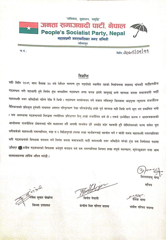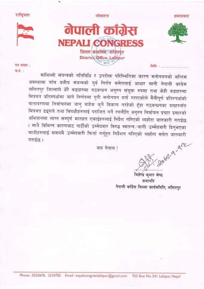 उम्मेदवारी मनोनयनको अन्तिम दिन गठबन्धनको सम्पुर्ण ब्यबस्थापन गर्न नसकिने भएकोले बागमती प्रदेस संयन्त्रको निर्णय अनुसार नेपाली कांग्रेस ललितपुरले प्रमुख उप प्रमुख सहित अधिकांस वडाहरुमा मनोनयन दर्ता गराएको विज्ञप्तीमा उल्येख छ ।
