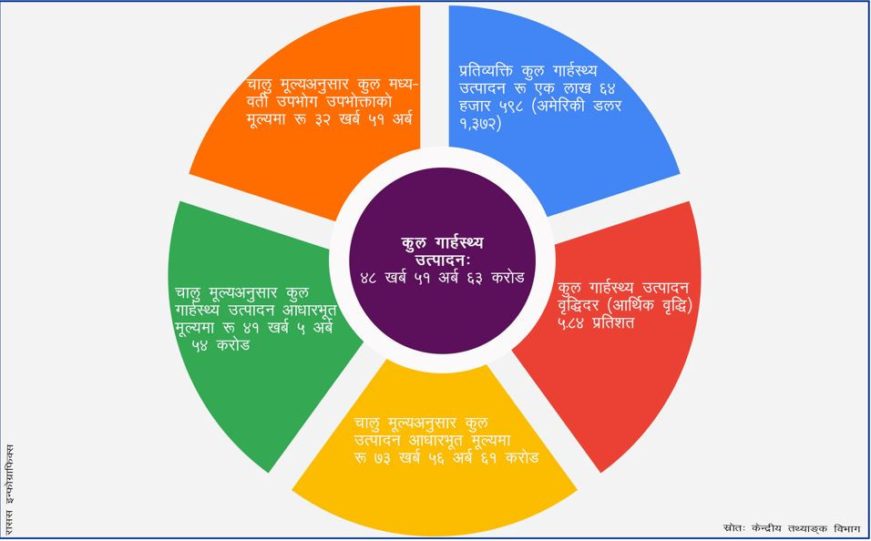 चालु मूल्यअनुसार कूल गार्हस्थ्य उत्पादन आधार मूल्यमा रु ४१ खर्ब पाँच अर्ब ५४ करोड बराबर रहँदा चालु मूल्यअनुसार कूल ग्रार्हस्थ्य उत्पादन उपभोक्ता मूल्यमा रु ४८ खर्ब ५१ अर्ब ६३ करोड बराबर पुगेको छ ।