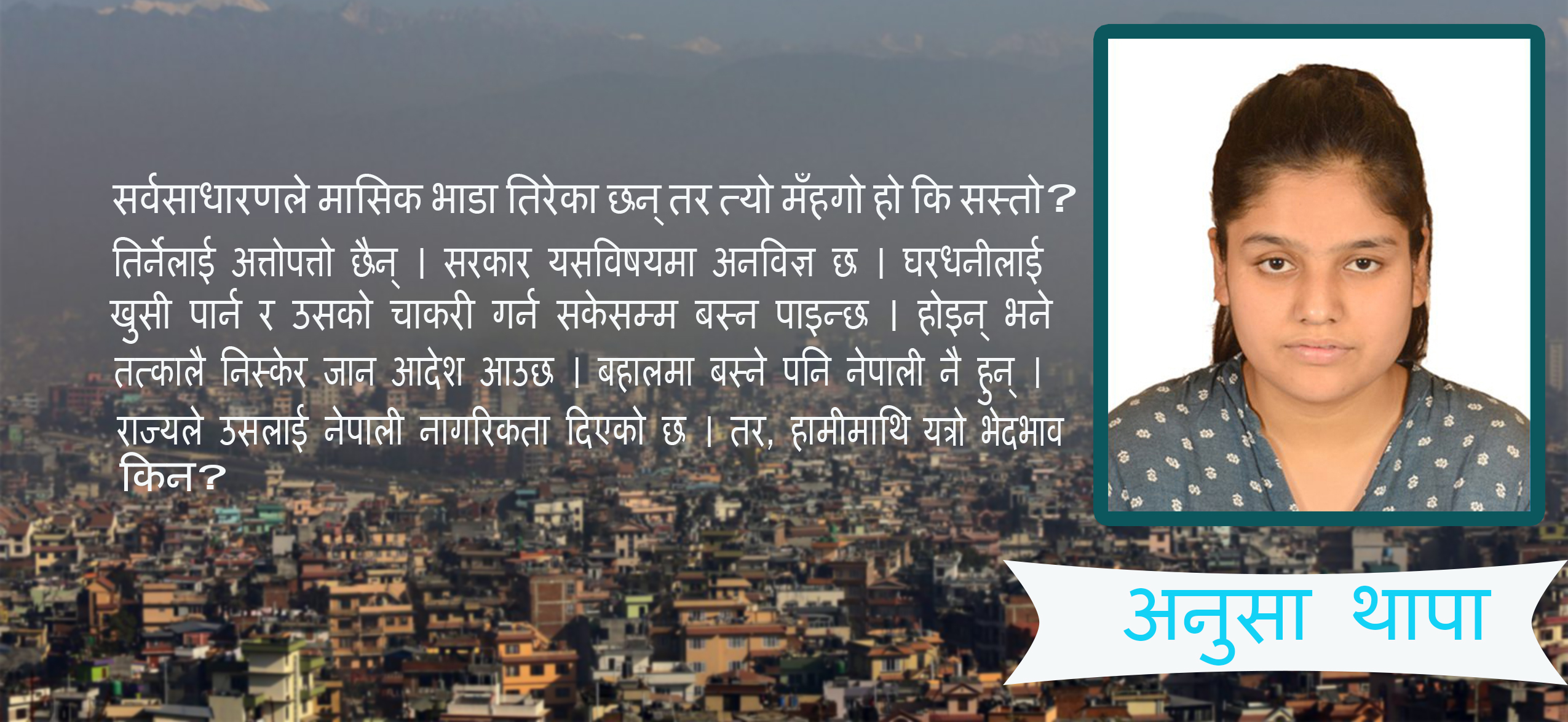 सर्वसाधारणले मासिक भाडा तिरेका छन् तर त्यो मँहगो हो कि सस्तो ? तिर्नेलाई अत्तोपत्तो छैन् । सरकार यसविषयमा अनविज्ञ छ । घरधनीलाई खुसी पार्न र उसको चाकरी गर्न सकेसम्म बस्न पाइन्छ । होइन् भने तत्कालै निस्केर जान आदेश आउछ । बहालमा बस्ने पनि नेपाली नै हुन् । राज्यले उसलाई नेपाली नागरिकता दिएको छ । तर, हामीमाथि यत्रो भेदभाव किन ? सरकार सबैको साझा हो कि घरधनीको मात्र ? प्रष्ट पार्नुपर्ने बेला भएको छ । घरधनीको अघि सरकारी पक्ष सबै मौन, किन ? हामी भने घरधनीले पेचेर पैसा लिएका छन् । तर, सरकारले घरबहाल करसमेत उठाउन सक्दैन् । न त बहालमा बस्नेको पिरलो हेरेर कुनै ऐनकानुन नै बनाउछ । घरमा भएका सबै कोठा बहालमा लगाइएको हुन्छ ।