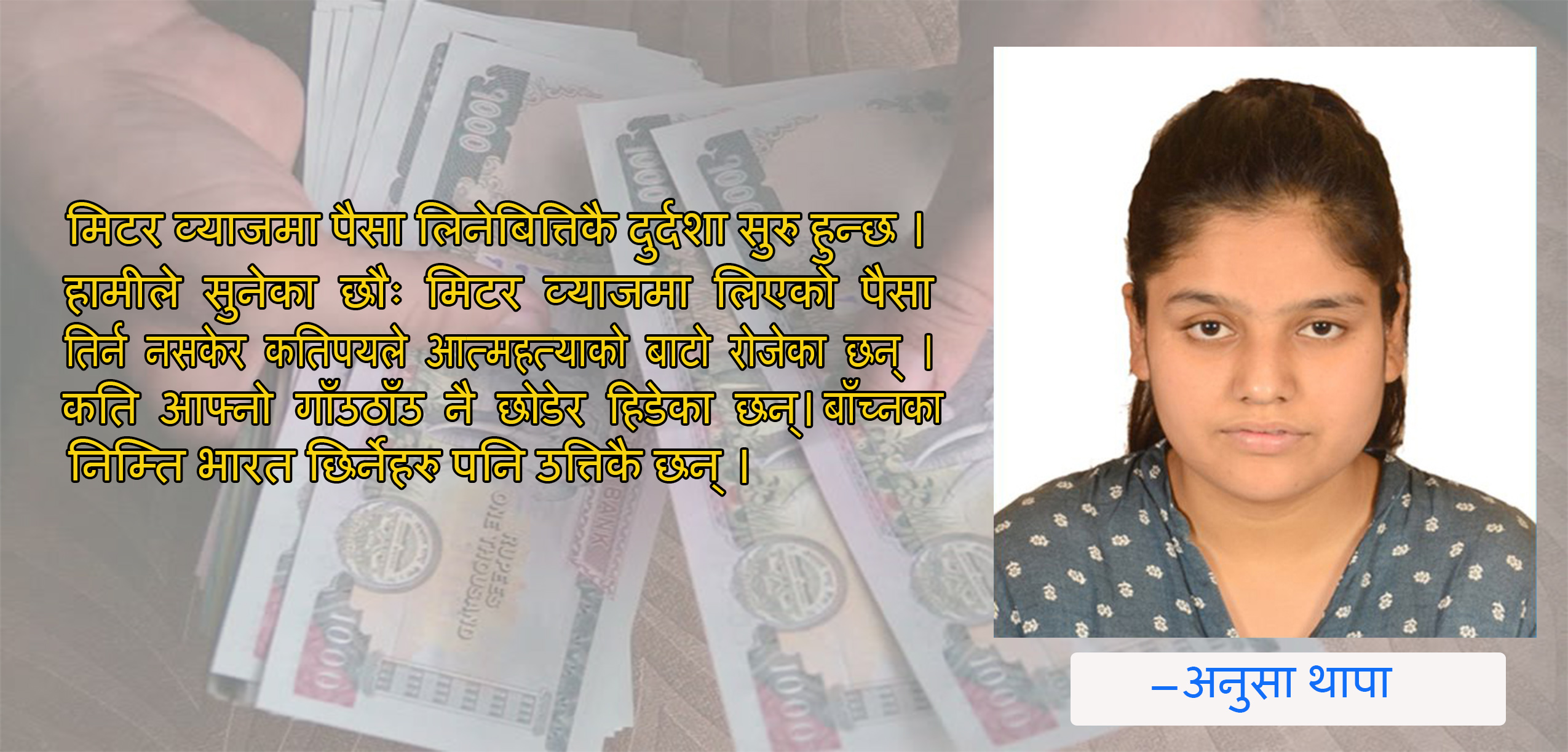 मिटर व्याजमा पैसा लिनेबित्तिकै दुर्दशा सुरु हुन्छ । हामीले सुनेका छौः मिटर व्याजमा लिएको पैसा तिर्न नसकेर कतिपयले आत्महत्याको बाटो रोजेका छन् । कति आफ्नो गाँउठाँउ नै छोडेर हिडेका छन् । बाँच्नका निम्ति भारत छिर्नेहरु पनि उत्तिकै छन् । नेपालको कानुनमा उल्लेख भएअनुसार यसरी मिटर व्याजमा पैसा लगाउन पाइन्छ । १० प्रतिशतभन्दा बढी व्याज लिएमा त्यसलाई गैरकानुनी मानिन्छ । एक लाखको पाँचदेखि ३० हजारसम्म मिटर व्याजमा लगाइएको छ । यस्तो मँहगो व्याजमा पैसा लगाउनेहरु कतिखेर भाग्नुपर्ने हो ? कतै प्रहरीको लगेर थुन्ने त होइनन् ? आफ्नो घरखेत खाइदिने पो हो कि ? भन्ने त्रासमा बसिरहेका हुन्छन् ।