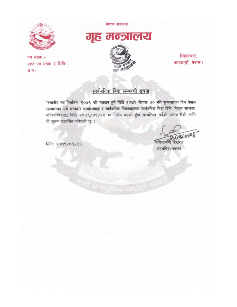 सरकारले स्थानीय तह निर्वाचनको मतदान हुने दिन वैशाख ३० गते शुक्रबार सार्वजनिक बिदा दिने निर्णय गरेको छ ।