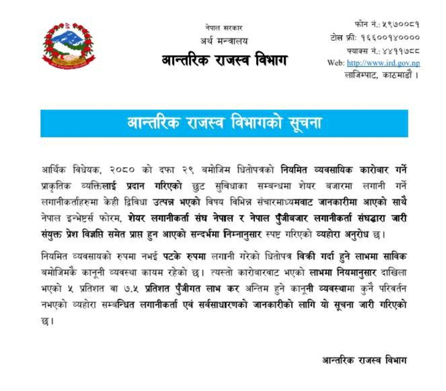 आन्तरिक राजस्व विभागले धितोपत्रको नियमित व्यवसायिक कारोबार गर्ने प्राकृतिक व्यक्तिलाई प्रदान गरिएको छुट सुविधाका विषयमा लिएको कर नीतिमा लगानीकर्ता द्विविधा उत्पन्न भएको बताएको छ ।