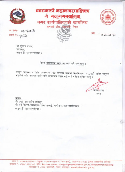 महानगरपालिका प्रमुख बालेन्द्र शाह व्यक्तिगत कामका लागि देश बाहिर रहेको कारण कार्यवाहक नगरप्रमुखको जिम्मा डंगोलले पाएकी हुन्। व्यक्तिगत कामका लागि भन्दै मेयर शाह हिजो साँझ भारत प्रस्थान गरेका छन्।