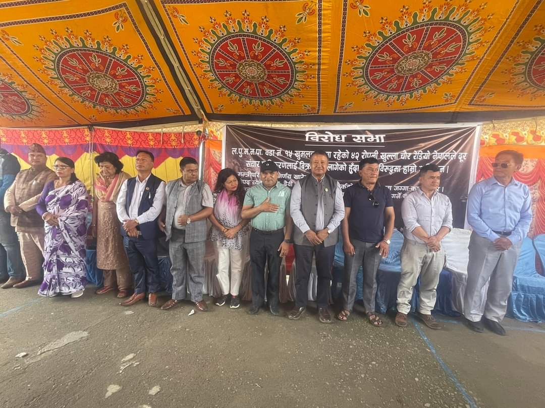 शनिबार ललितपुरको रेडियो नेपालको जग्गामा आयोजित विरोध सभालाई सम्बोधन गर्दै प्रतिनिधि सभा सदस्य रोसनी कार्की, प्रदेश सभा सदस्यहरु प्रेमभक्त महर्जन, रघुनाथ महर्जन, नेकपा एमालेका ललितपुर जिल्ला अध्यक्ष पुरुषोत्तम आचार्य, पूर्व सांसद धना खतिवडा, पूर्व वडा अध्यक्ष सुदर्शन मिश्र, वडा अध्यक्ष सुरेश बहादुर शाहीलगायतले विरोध जनाएका थिए ।