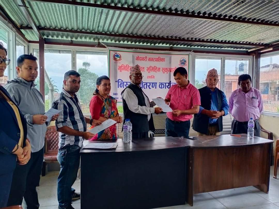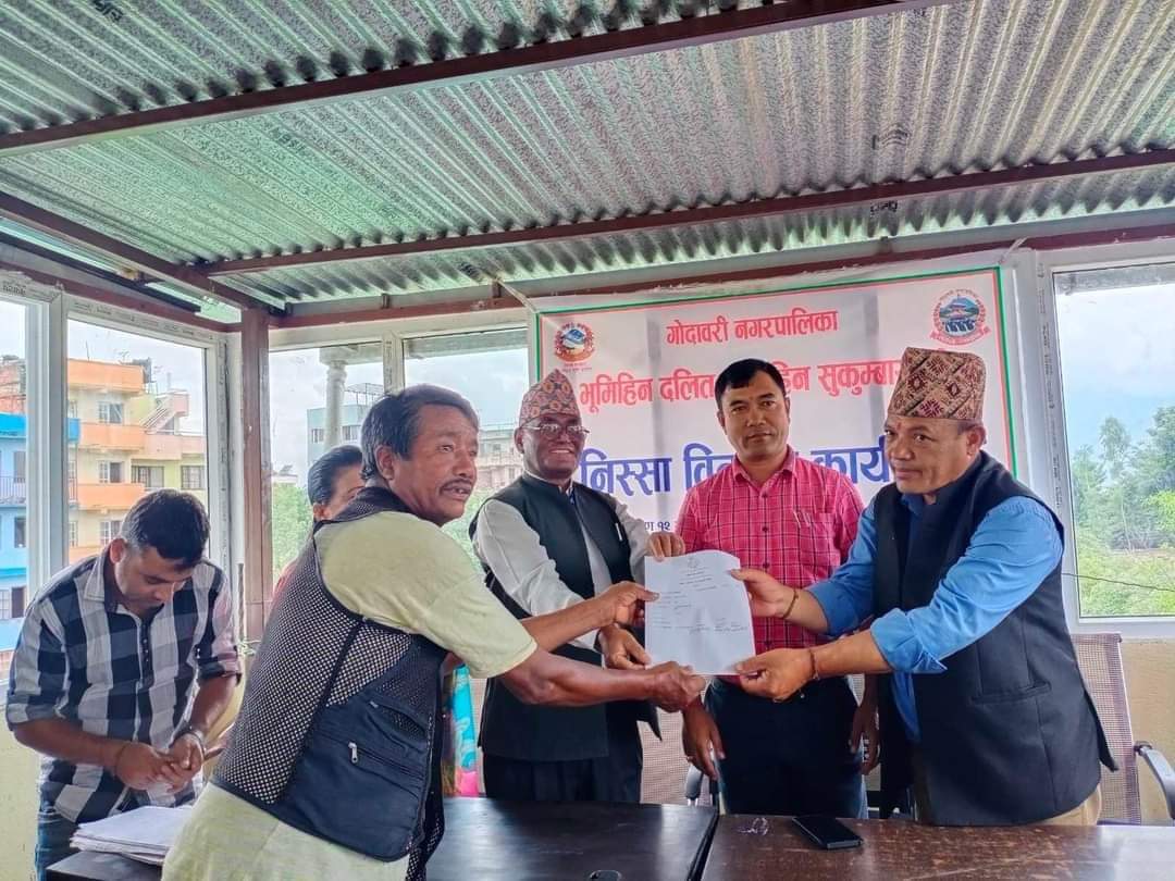 गोदावरी नगरपालिका-१२ ठेचोका सुकुम्वासीहरुलाई निस्सा वितरण गरिएको छ । भूमि आयोग जिल्ला समिति ललितपुरले गोदावरी नगरपालिकाका प्रमुख गजेन्द्र महर्जन र वडा १२ का अध्यक्ष जगत महर्जन, जिल्ला समन्वय समिति सदस्य शोभा केसीसहितको उपस्थितिमा ठेचोका पाँचजना भूमिहीन सुकुम्वासीहरुलाई निस्सा वितरण गरेको हो ।