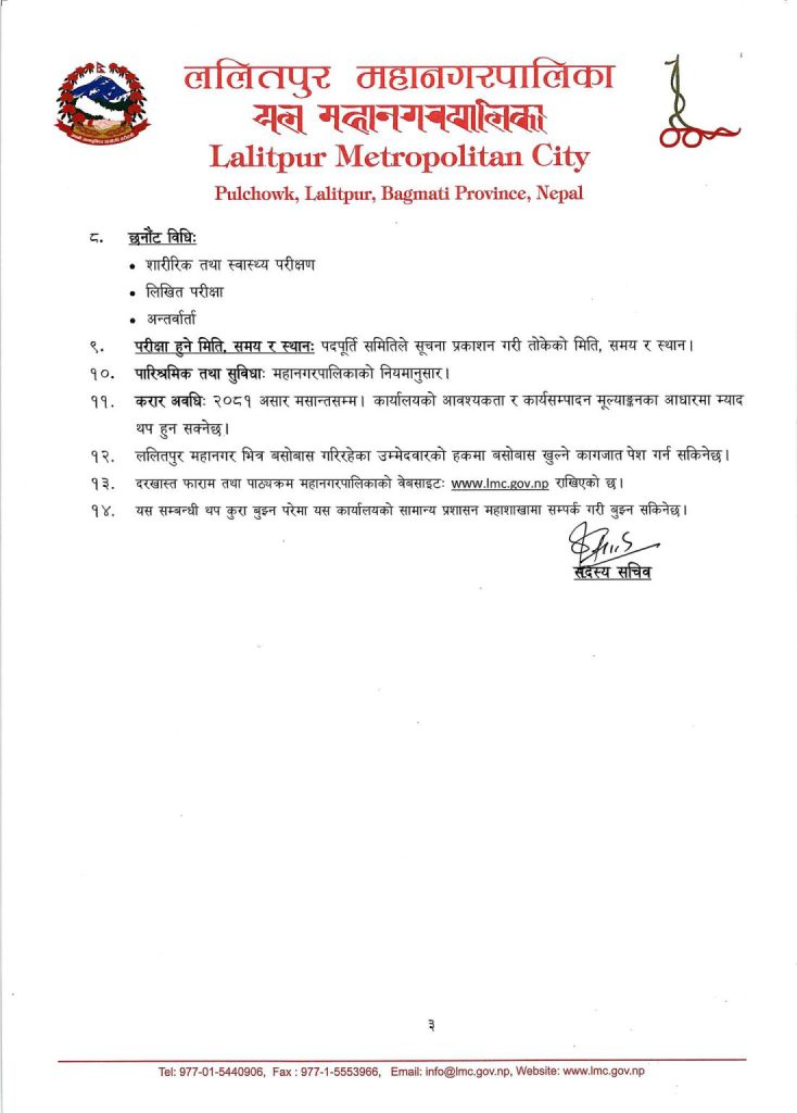 यही कात्तिक २४ गतेसम्म महानगरको कार्यालयबाटै र अनलाइनबाट दर्खास्त दिन सकिनेछ ।१८ वर्ष पूरा भई ३० वर्ष ननाघेका र पूपू सैनिक तथा प्रहरी भए ४० वर्ष ननाघेका व्यक्तिले दर्खास्त दिन मिल्नेछ । न्युनतम शैक्षिक योग्यता ८ कक्षा उतीर्ण भएको हुनुपर्नेछ ।