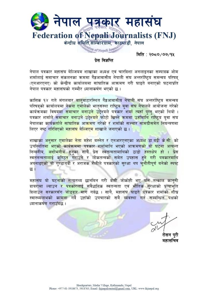 कात्तिक १४ गते मंगलबार बालुवाटारस्थित एनआरएनए कार्यालयमा नेकपा एमालेको भ्रात्रीसंस्था, राष्ट्रिय युवा संघ नेपाल, ले आयोजना गरेको कार्यक्रमका विषयमा समाचार बनाउने उद्देश्यले पुगेका पत्रकार शर्मामाथि आक्रमणको घटना अत्यन्त निन्दनीय, अशोभनीय साथै प्रेस स्वतन्त्रतामाथिको ठाडो हस्तक्षेप भएको महासंघको ठहर छ ।