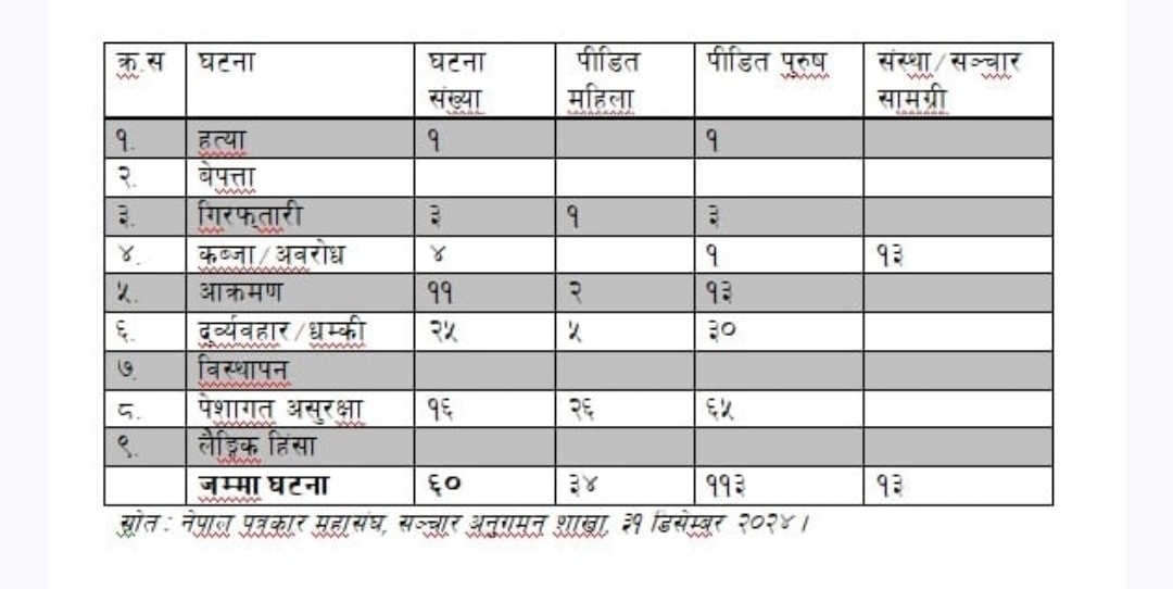 नेपाल पत्रकार महासंघ, सञ्चार अनुगमन शाखामा यो वर्ष प्रेस स्वतन्त्रता हनन्का ६० वटा घटना अभिलेख भएका छन् । विगतका वर्षको तुलनामा यस वर्ष प्रेस स्वतन्त्रता हनन्का घटना वृद्धि भएको छ । सन् २०२३ मा प्रेस स्वतन्त्रता हनन्का ५८ र स्न २०२२ मा ५३ वटा घटना अभिलेख भएका थिए । यस वर्ष प्रेस स्वतन्त्रता हनन्का ६० वटा घटना हँुदा ३४ जना पत्रकार महिला र १ सय १३ जना पुरुष पत्रकार पीडित भएका छन् भने १३ वटा सञ्चार संस्था प्रभावित भएका छन् ।