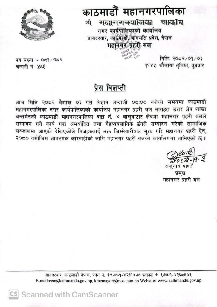 काठमाडौँ महानगरपालिकाको प्रहरी बलले बालुवाटारमा एक व्यक्तिप्रति प्रहरी टोलीले गरेको अमर्यादित व्यवहारमा संलग्न नगर प्रहरीमाथि कारबाही गरेको छ ।