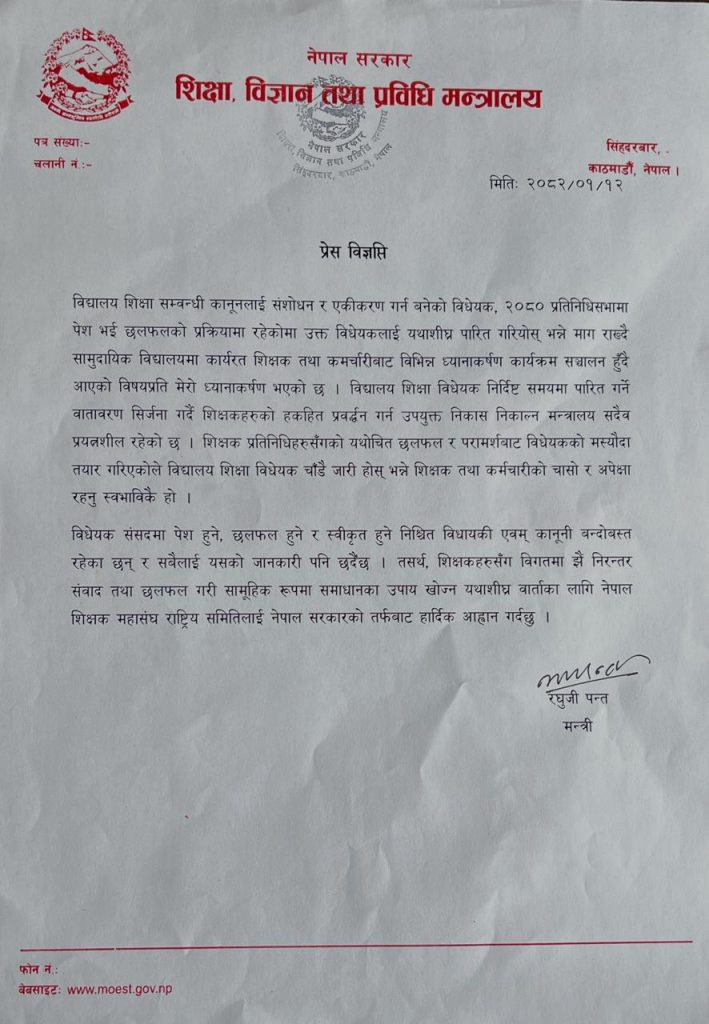 नवनियुक्त शिक्षा, विज्ञान तथा प्रविधिमन्त्री रघुजी पन्तले आन्दोलनरत शिक्षकहरूलाई वार्तामा बोलाएका छन् । विद्यालय शिक्षा ऐन जारी गर्नुपर्ने मागसहित गत चैत २० गतेदेखि आन्दोलन गर्दै आएका शिक्षकहरूलाई वार्ताका लागि बोलाएका हुन् ।
