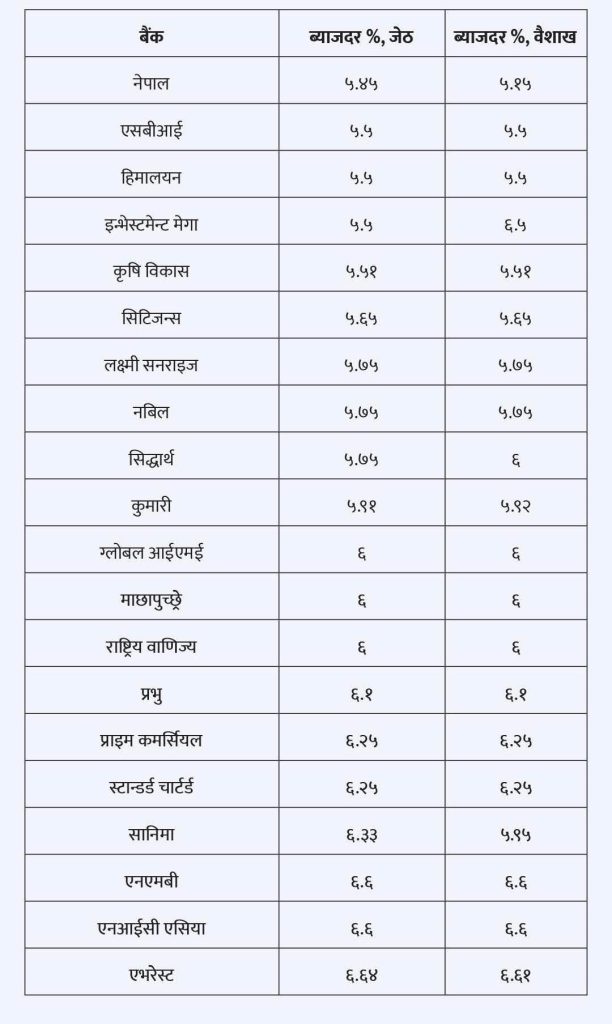वाणिज्य बैंकहरूले निक्षेपको नयाँ ब्याजदर तोकेका छन् । नयाँ महिनाका लागि महिना सुरु हुनुअघि नै ब्याजदर निर्धारण गर्नुपर्ने व्यवस्था बमोजिम बैंकहरूले जेठ महिनाका लागि यस्तो ब्याजदर निर्धारण गरेका हुन् । तोकिएका ब्याजदर बिहीबारदेखि लागु हुनेछ ।