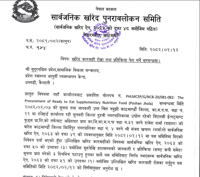 सो ठेक्का प्रक्रियाको एक आवेदकले हालेको उजुरीका आधारमा सार्वजनिक खरीद पुनरावलोकन समितिले जेठ १२ गते सुदुरपश्चिम प्रदेश, सामाजिक विकास मन्त्रालय, प्रदेश स्वास्थ्य आपूर्ति व्यवस्थापन केन्द्रलाई एक पत्र पठाउँदै अनिश्चितकालका लागि खरीद कारबाही प्रक्रिया रोक्न निर्देशन दिएको हो ।