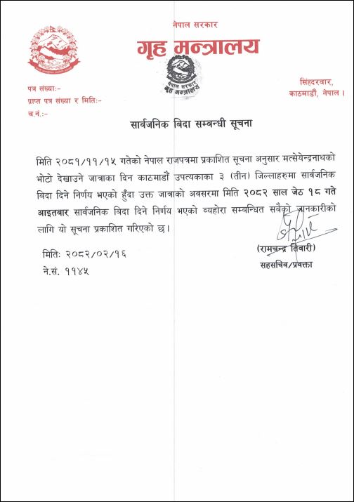 मच्छिन्द्रनाथको भोटो देखाउने जात्रा भएकाले त्यसदिन बिदा दिइएको गृहमन्त्रालयका प्रवक्ता एवं सहसचिव रामचन्द्र तिवारीले जानकारी दिए।