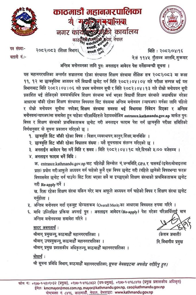 काठमाडौँ महानगरपालिकाले शैक्षिक सत्र २०८२–०८३ का लागि कक्षा ११ र १२ को छात्रवृत्तिमा रिक्त रहेका सिटहरूमा भर्नाका लागि पुनः अनलाइन आवेदन आह्वान गरेको छ। प्रवेश परीक्षा दिएर पनि पहिलो र दोस्रो मनोनयन सूचीमा नपरेका विद्यार्थीहरूका लागि पुनः आवेदन खुलाइएको हो ।