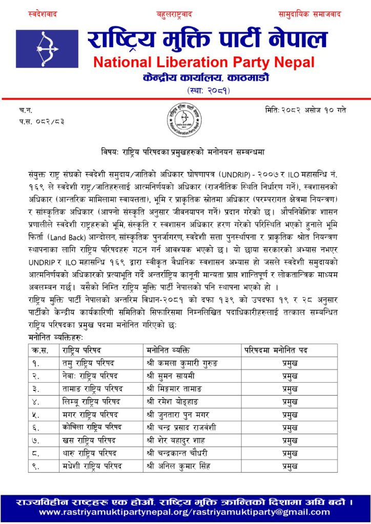 राष्ट्रिय मुक्ति पार्टी नेपालले ९ राष्ट्रिय परिषद् प्रमुख मनोनीत गरेको छ।
