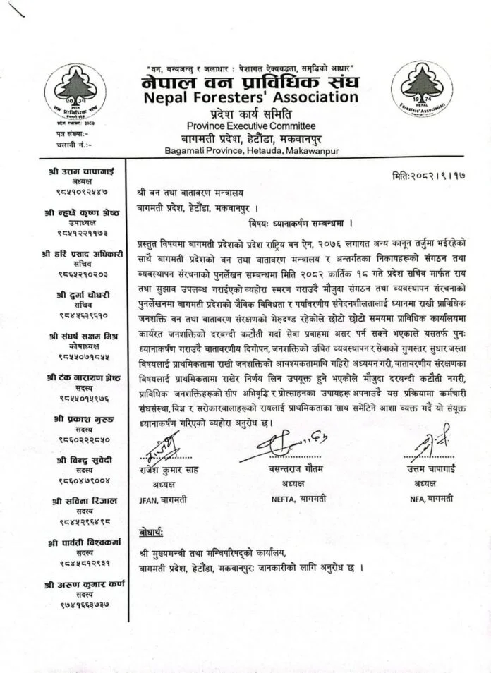 नेपाल वन प्राविधिक सङ्घ (NEFTA), नेपाल फरेस्टर्स एसोसिएसन (NFA) र जुनियर फरेस्टर्स एसोसिएसन नेपाल (JFAN) बागमती प्रदेश कार्य समितिले वन तथा वातावरण मन्त्रालयलाई बुझाएको ध्यानाकर्षण पत्रमा प्रदेशको जैविक विविधता र पर्यावरणीय संवेदनशीलतालाई ध्यानमा राखी सङ्गठन संरचना पुनर्लेखन गर्न आग्रह गरिएको छ।