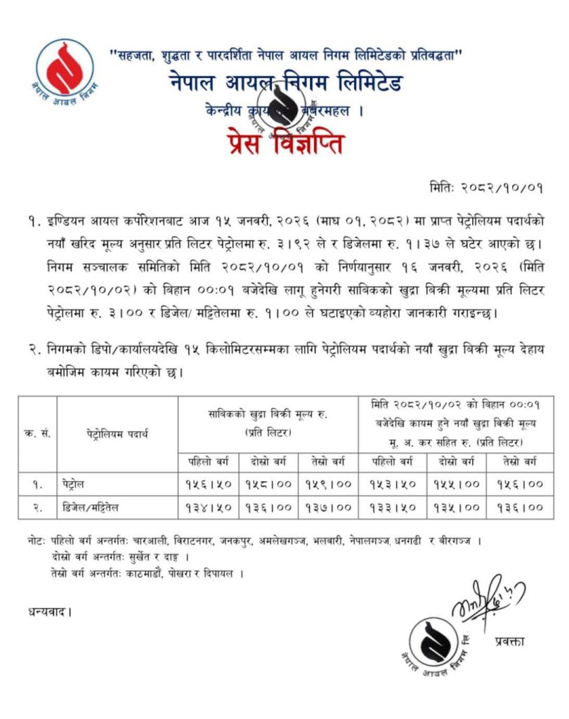 इन्डियन आयल कर्पोरेसनबाट माघ १ मा प्राप्त पेट्रोलियम पदार्थको नयाँ खरिद मूल्यअनुसार निगम सञ्चालक समितिले नयाँ मूल्यसूची निर्धारण गरेको हो।