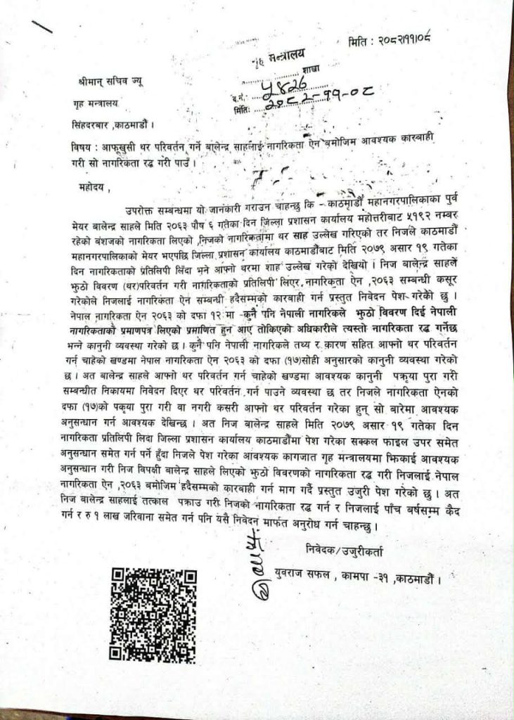 रास्वपाका वरिष्ठ नेता एवं प्रधानमन्त्रीका उम्मेदवार बालेन्द्र शाह (बालेन) विरुद्ध नागरिकता सम्बन्धी गम्भीर आरोपसहित गृह मन्त्रालयमा उजुरी दर्ता भएको छ।