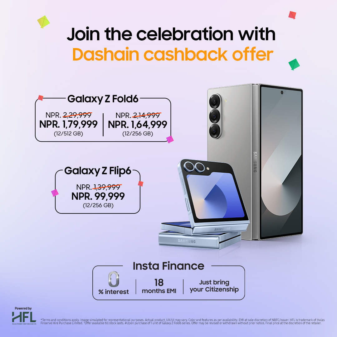 यो दशैंमा सामसङ नेपालले आफ्ना ग्यालेक्सी जेड फोल्ड६ र ग्यालेक्सी जेड फ्लिप६ स्मार्टफोनको मूल्य घटाउँदै।