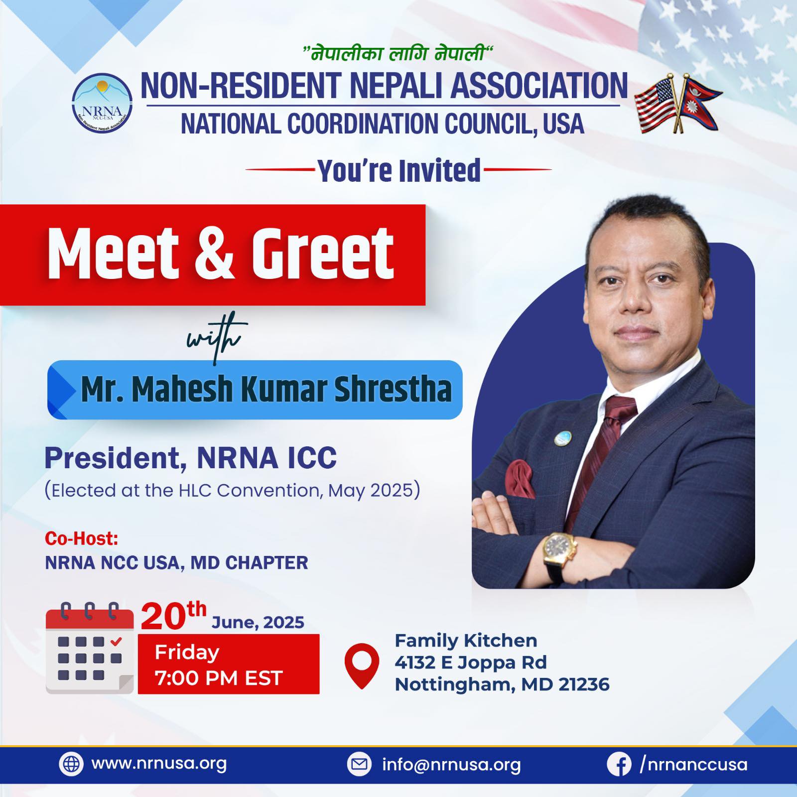 एनसीसी अमेरिकाले एनआरएनए अध्यक्ष श्रेष्ठको स्वागतमा शुक्रबार भव्य कार्यक्रम गर्दै
